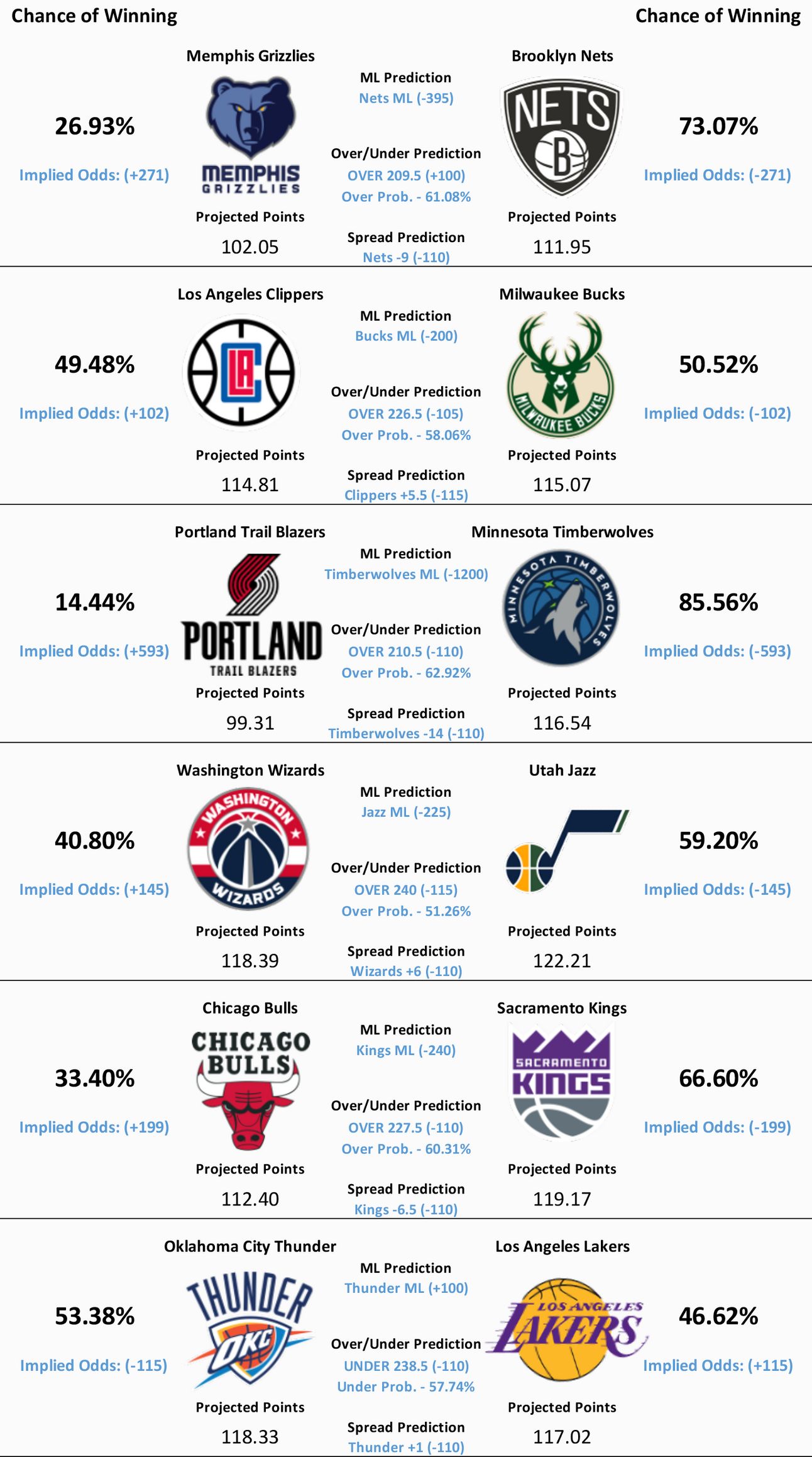 Six NBA games are scheduled to take place today. Our model’s predictions for all six matchup can be found below.
