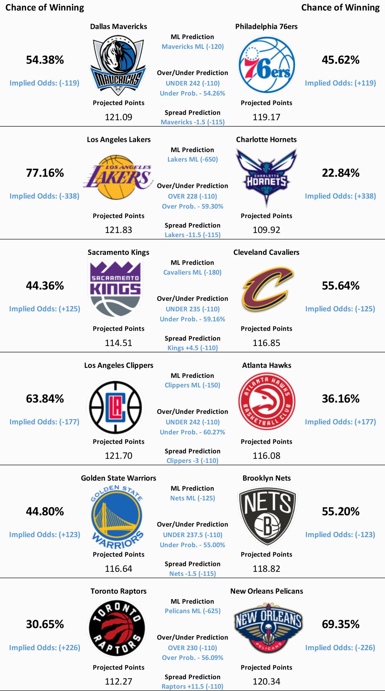 Model Predicts- Mavericks ML, UNDER 242, Mavericks -1.5