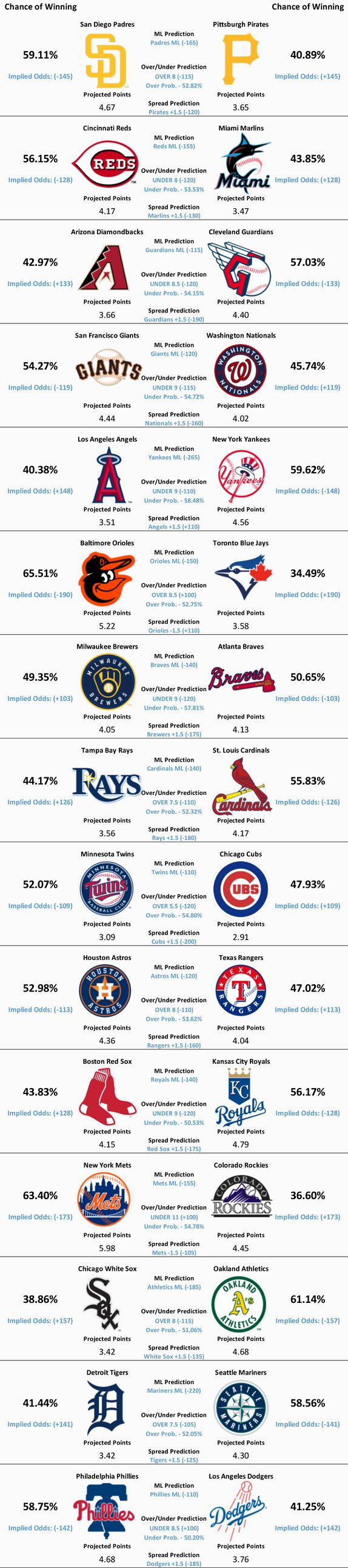 15 MLB games are scheduled to take place today. Our model’s predictions for all 15 matchups can be found below.