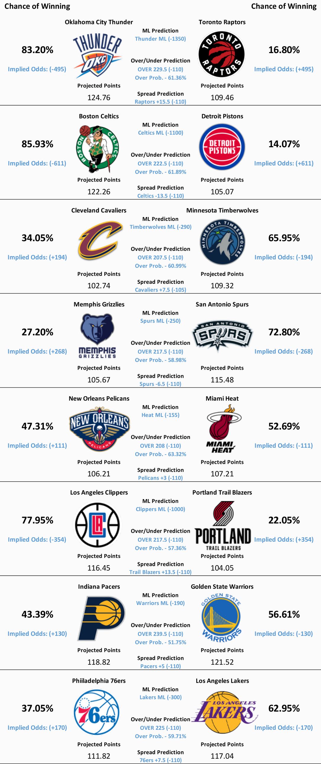 Eight NBA games are scheduled to take place today. Our model’s predictions for all eight matchups can be found below.