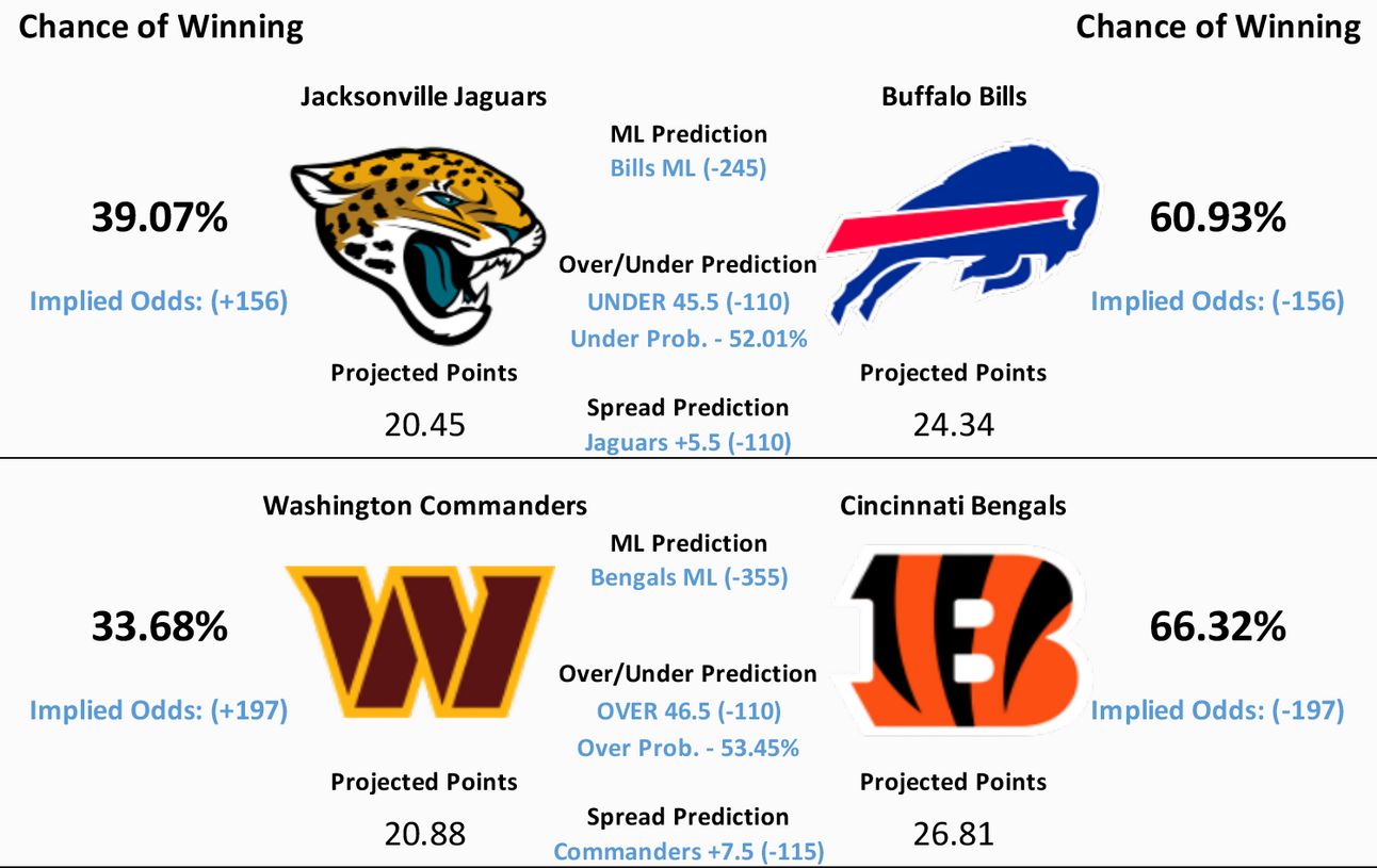 Model Predicts- Bengals ML, OVER 46.5, Commanders +7.5