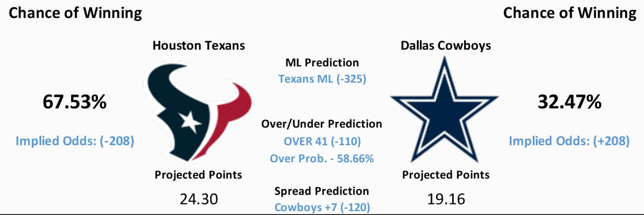 Model Predicts- Texans ML, OVER 41, Cowboys +7