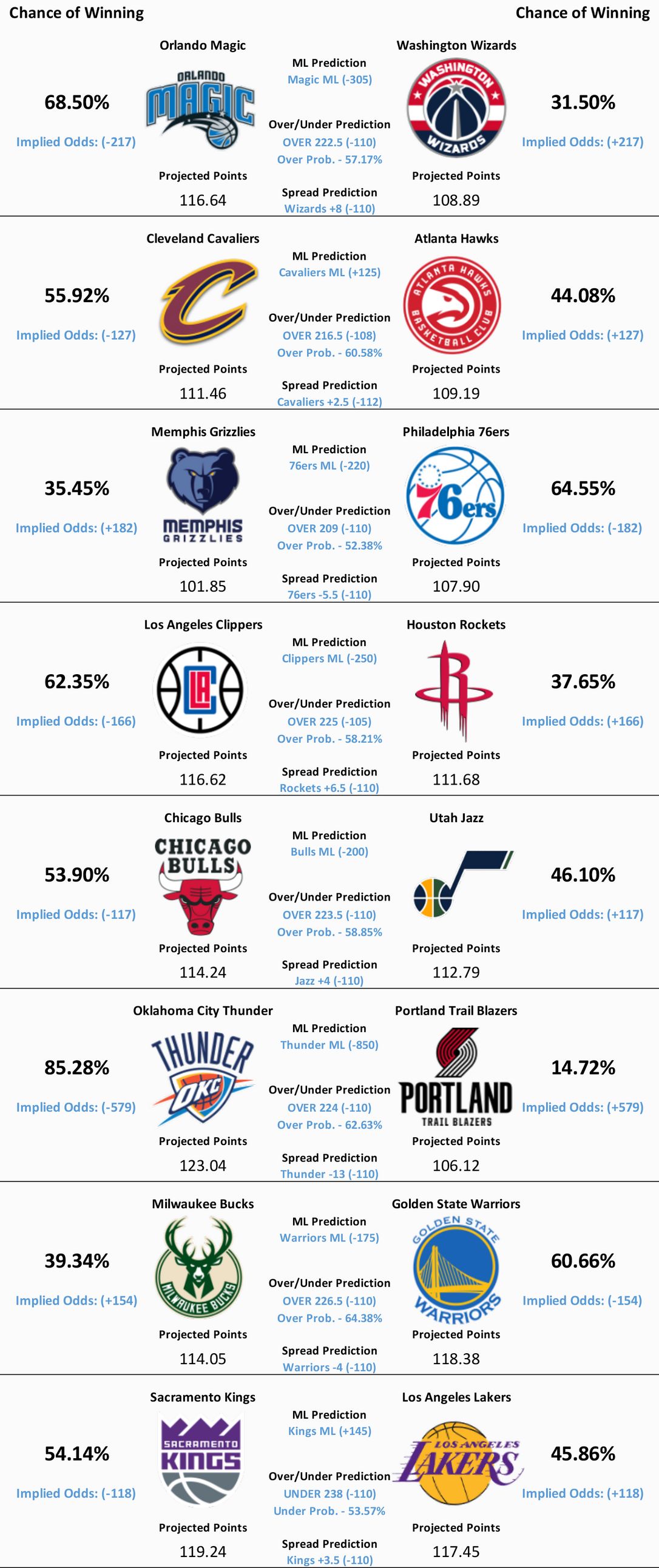 Eight NBA games are scheduled to take place today. Our model’s predictions for all eight matchups can be found below.