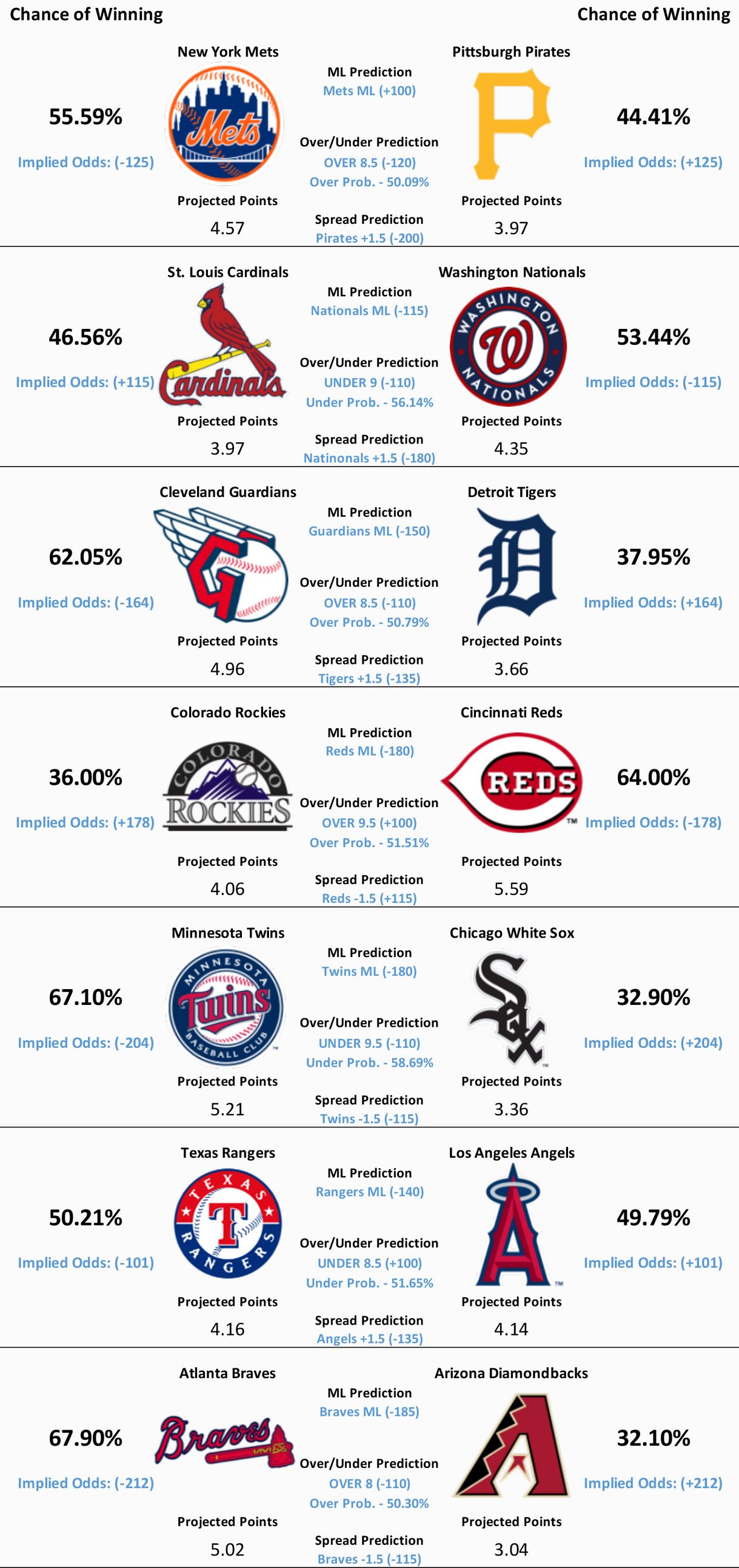 Model Predicts- Nationals ML, UNDER 9, Nationals +1.5