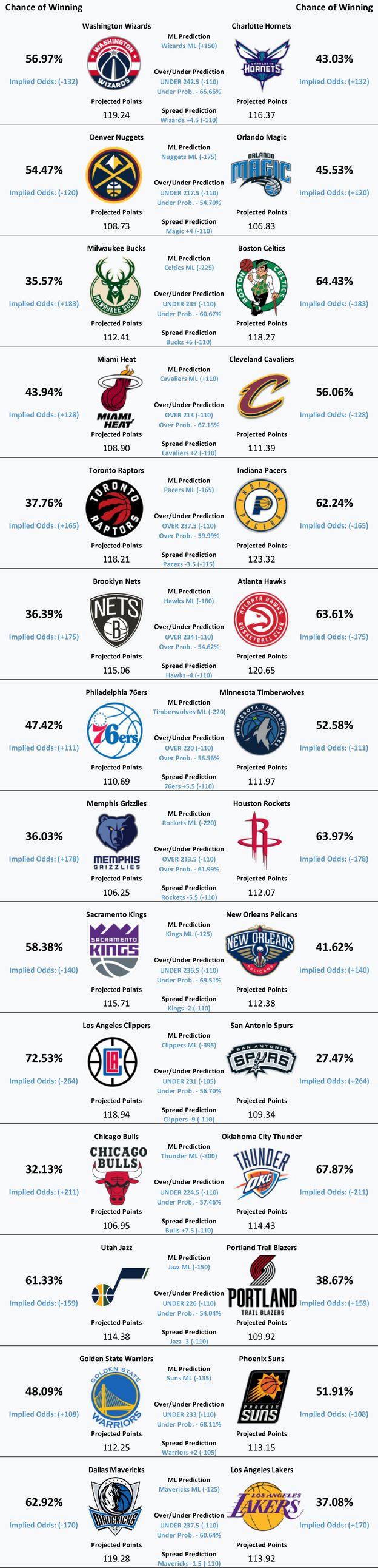 Due to no games being scheduled for Thanksgiving day, the NBA stuffed 14 games into today’s slate. Our model’s predictions for all 14 matchups can be found below.