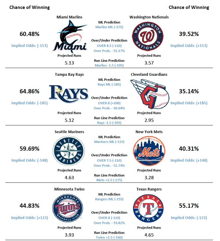 There are 16 MLB games scheduled to take place throughout this afternoon and evening. However, due to today’s Cubs/Reds doubleheader, our model has predictions for 14 of today’s matchups.
