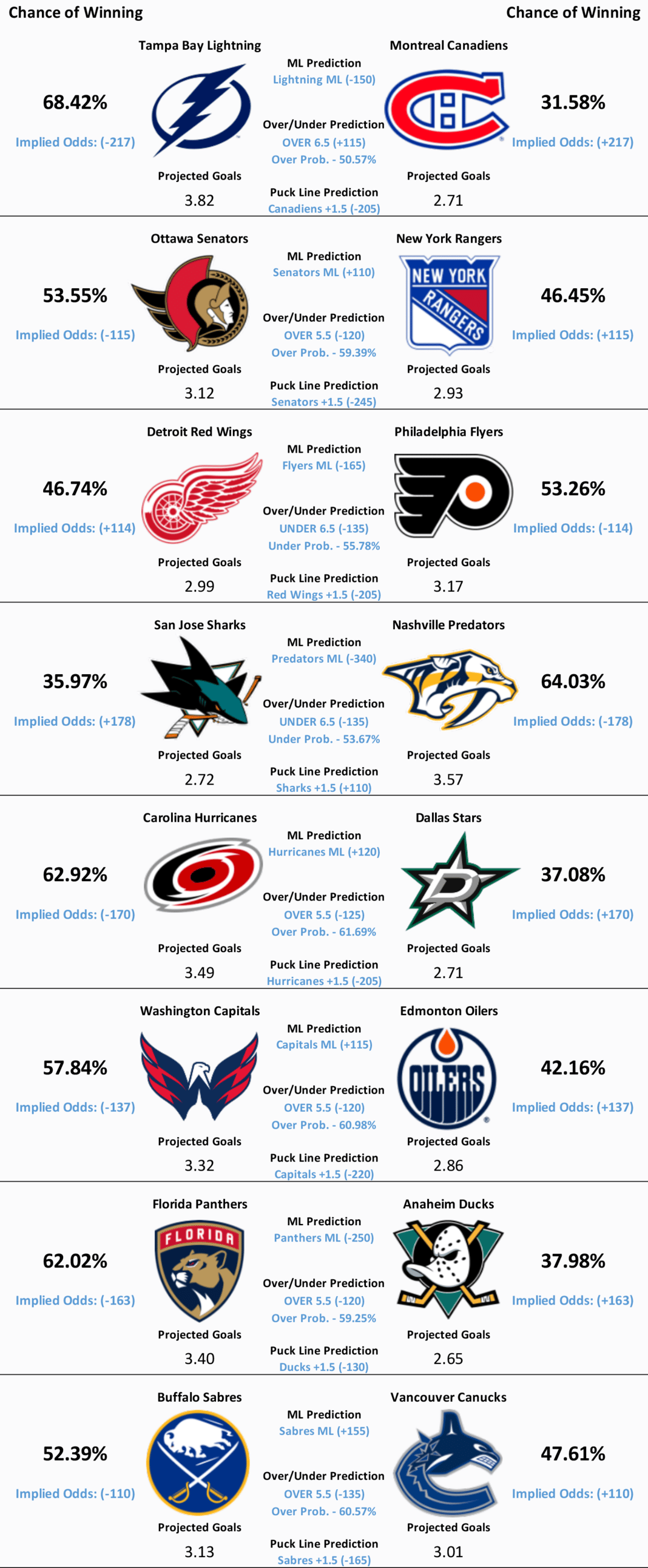 Eight NHL games are scheduled to take place today. Our model’s predictions for all eight matchups can be found below.