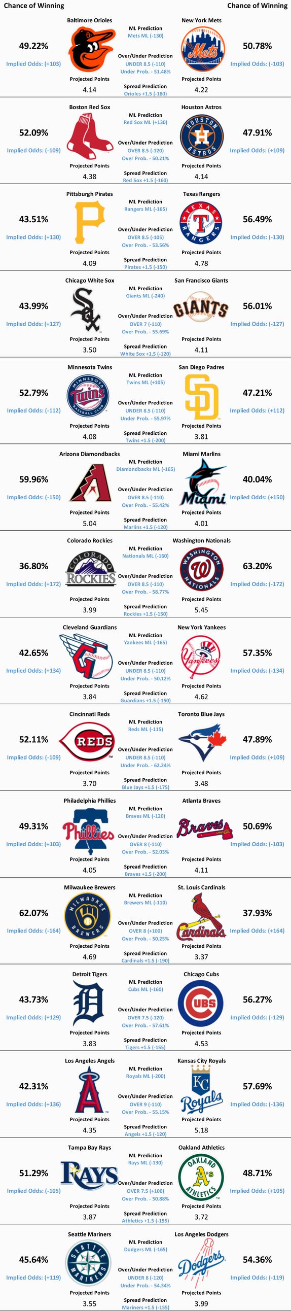 15 MLB games are scheduled to take place today. Our model’s predictions for all 15 matchups can be found below.