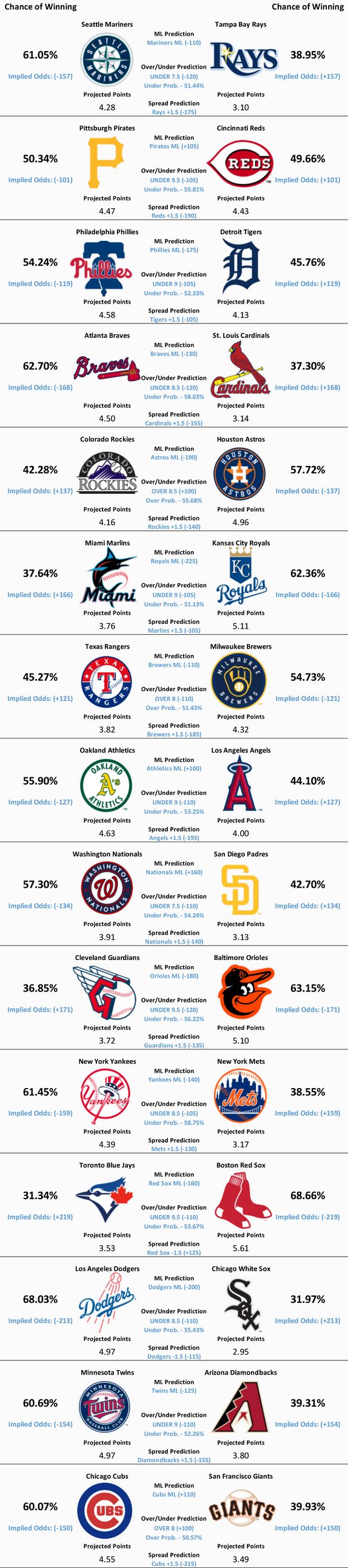 Model Predicts- Mariners ML, UNDER 7.5, Rays +1.5