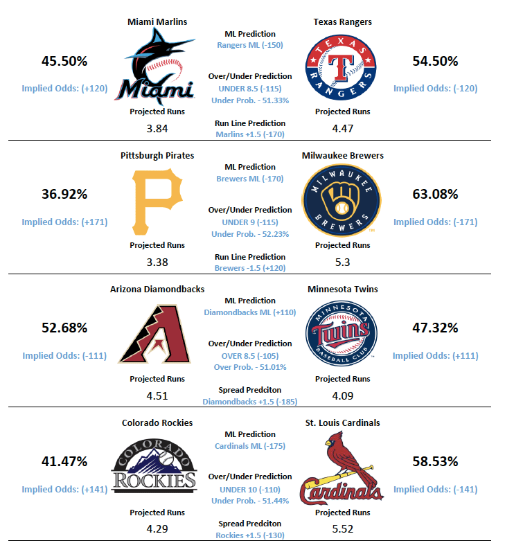 There are 14 MLB games scheduled to take place throughout this afternoon and evening, and our model has predictions for all 14 matchups. You can see all of today’s predictions below.