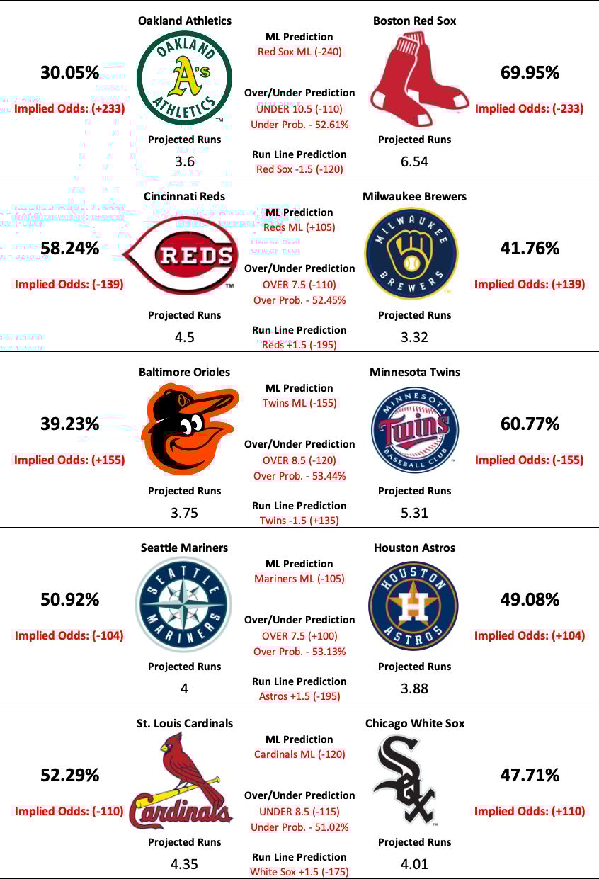 There are 15 MLB games scheduled to take place today. However, due to some gaps in the season data, our model has predictions for 14 of today’s matchups.