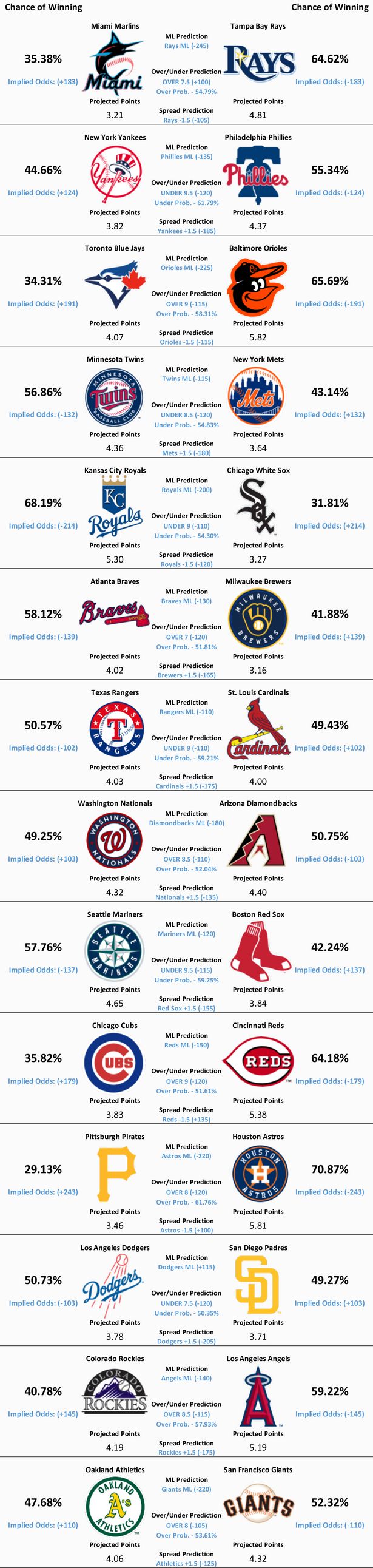 14 MLB games are scheduled to take place today. Our model’s predictions for all 14 matchups can be found below.