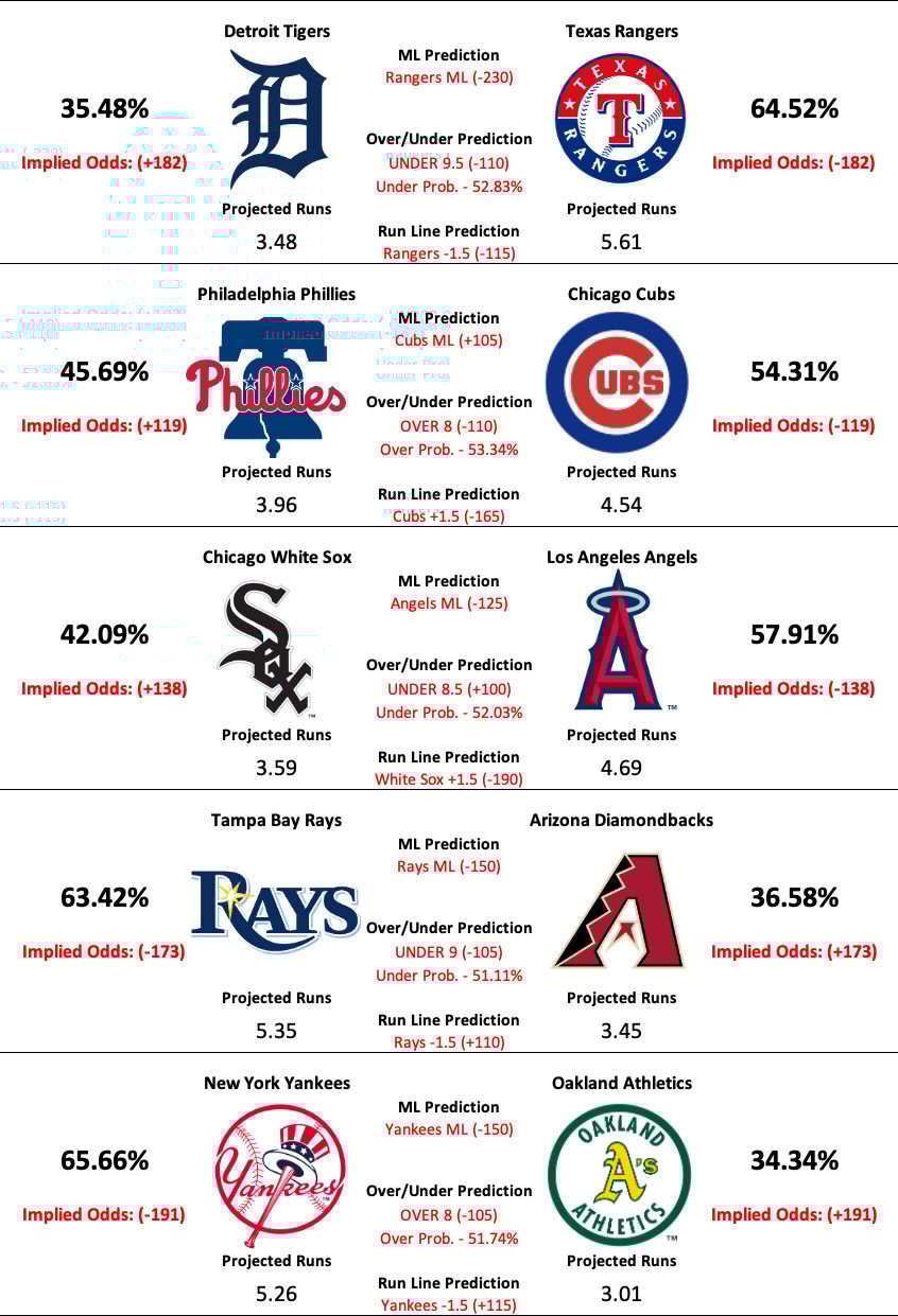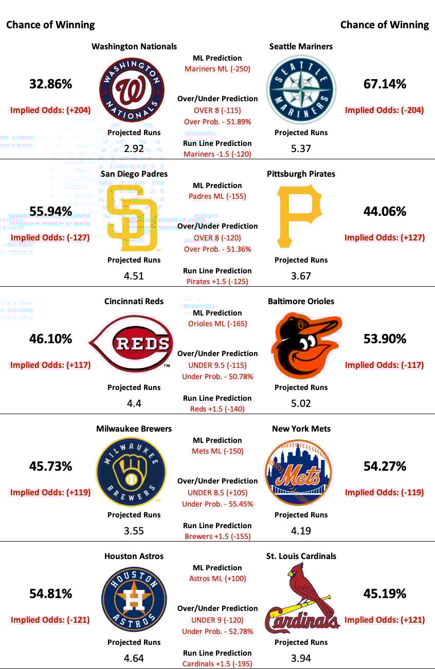 There are 15 MLB games scheduled to take place today. However, due to some gaps in the season data and lines being unavailable at the time the model was run, our model has predictions for 10 of today’s matchups.