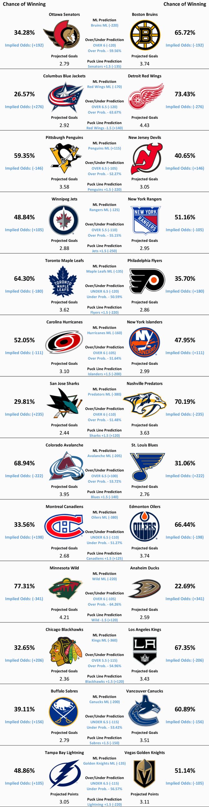 13 NHL games are scheduled to take place today. Our model’s predictions for all 13 matchups can be found below.