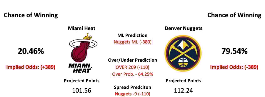 Denver has never won an NBA championship since being established in 1967, but our model likes that to change tonight. Will we see that prediction come to fruition, or do the Heat still have some gas left in the tank?