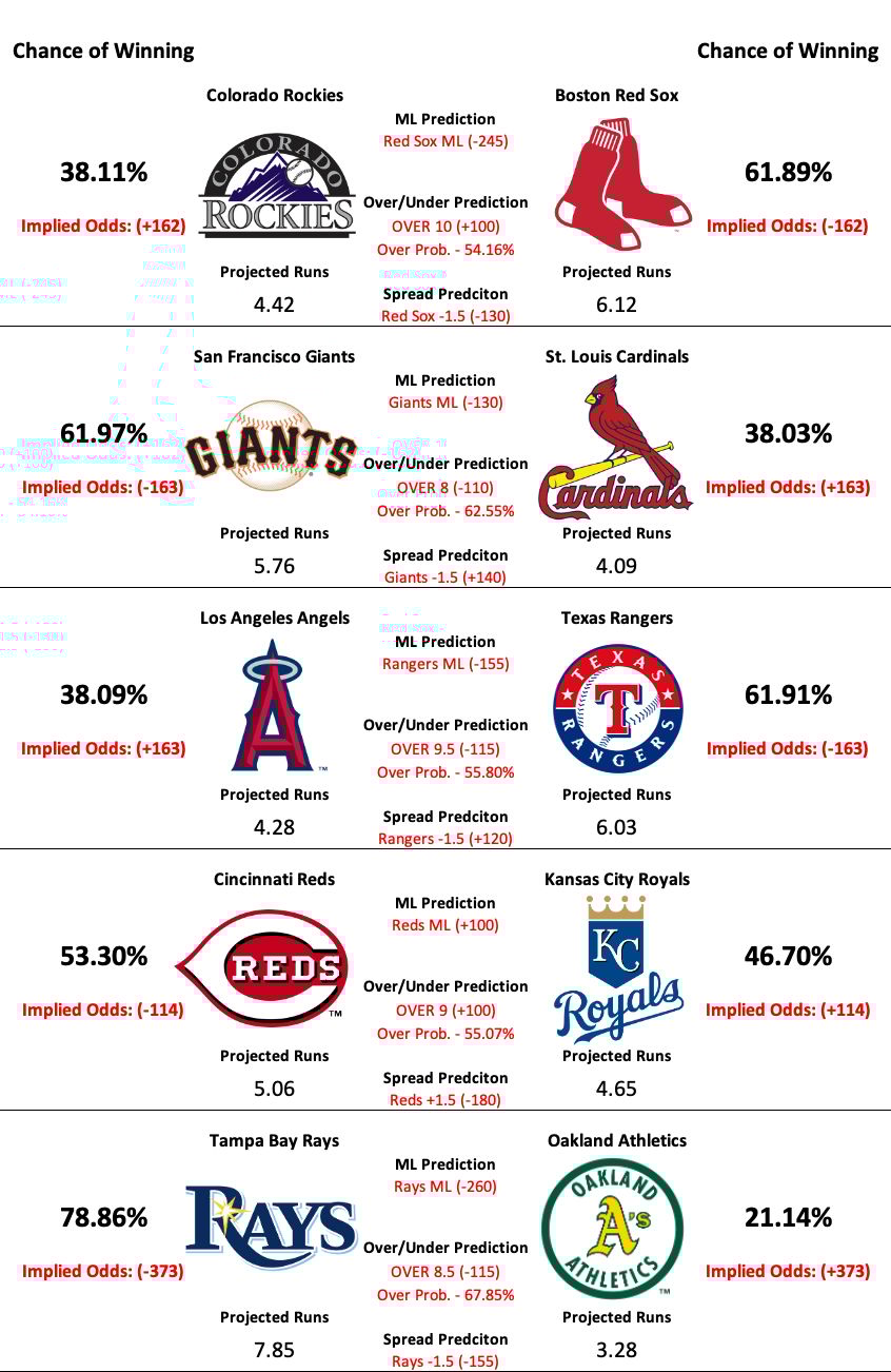 There are eight MLB games scheduled to take place on Monday. However, due to the Braves/Tigers game not having odds available when the model was run, our model has predictions for seven of today’s matchups.