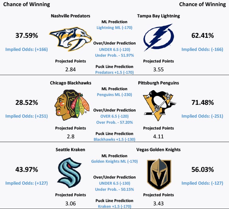 Model Predicts- Lightning ML, UNDER 6.5, Predators +1.5