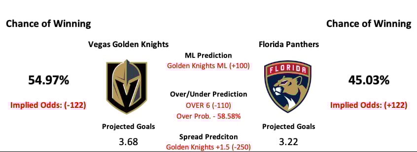 There is one NHL game scheduled to take place with evening, with that matchup being Game 3 of the Stanley Cup Finals between the Las Vegas Golden Knights and Florida Panthers. Vegas owns a 2-0 series lead after dominating Games 1 and 2 at home, and our model likes the Golden Knights to go up 3-0 in the series tonight.