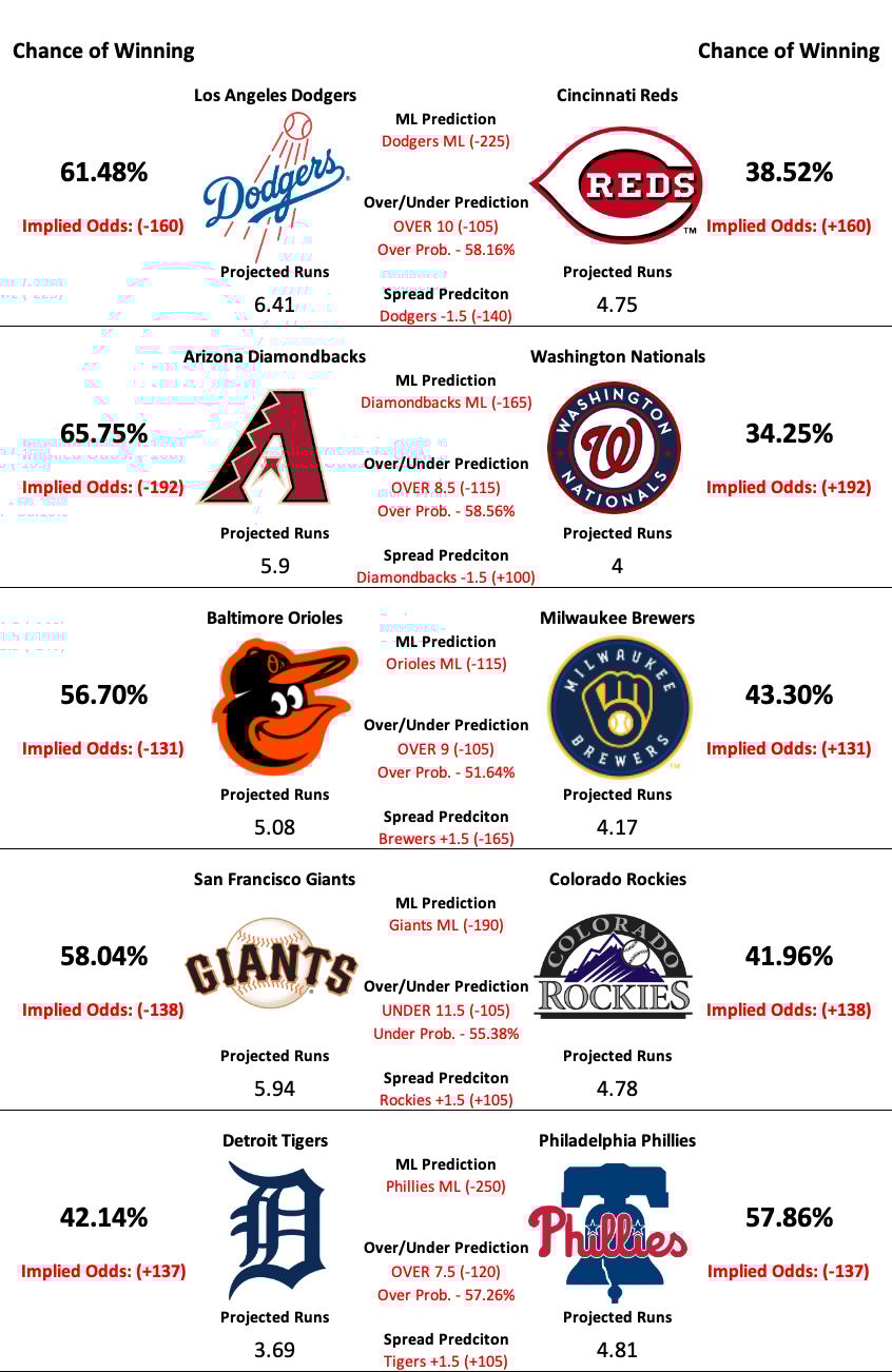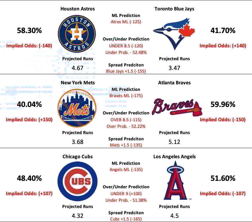 There are 12 games scheduled for Thursday afternoon and evening in the MLB, with one doubleheader in the mix due to poor air quality in New York over the last several days. However, due to some gaps in the early season data, our model has predictions for eight of today’s 12 matchups.