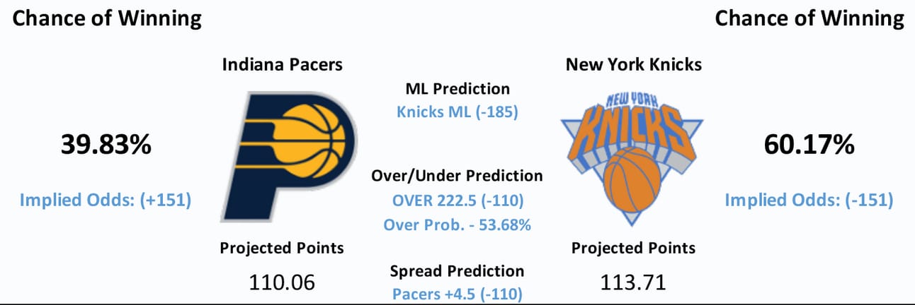 Model Predicts- Knicks ML, OVER 222.5, Pacers +4.5