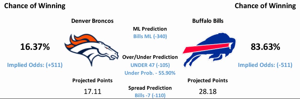 There is one NFL game scheduled to take place today, with that game featuring the Bills and Broncos in Buffalo, New York. Our model’s predictions for that matchup can be found below.
