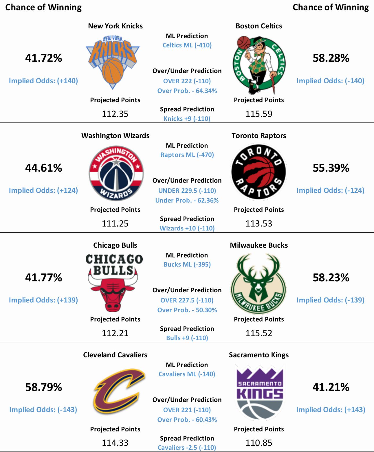 A slow day of NBA basketball is upon us, as just four games are scheduled to take place today. Our model’s predictions for all four matchups are below.
