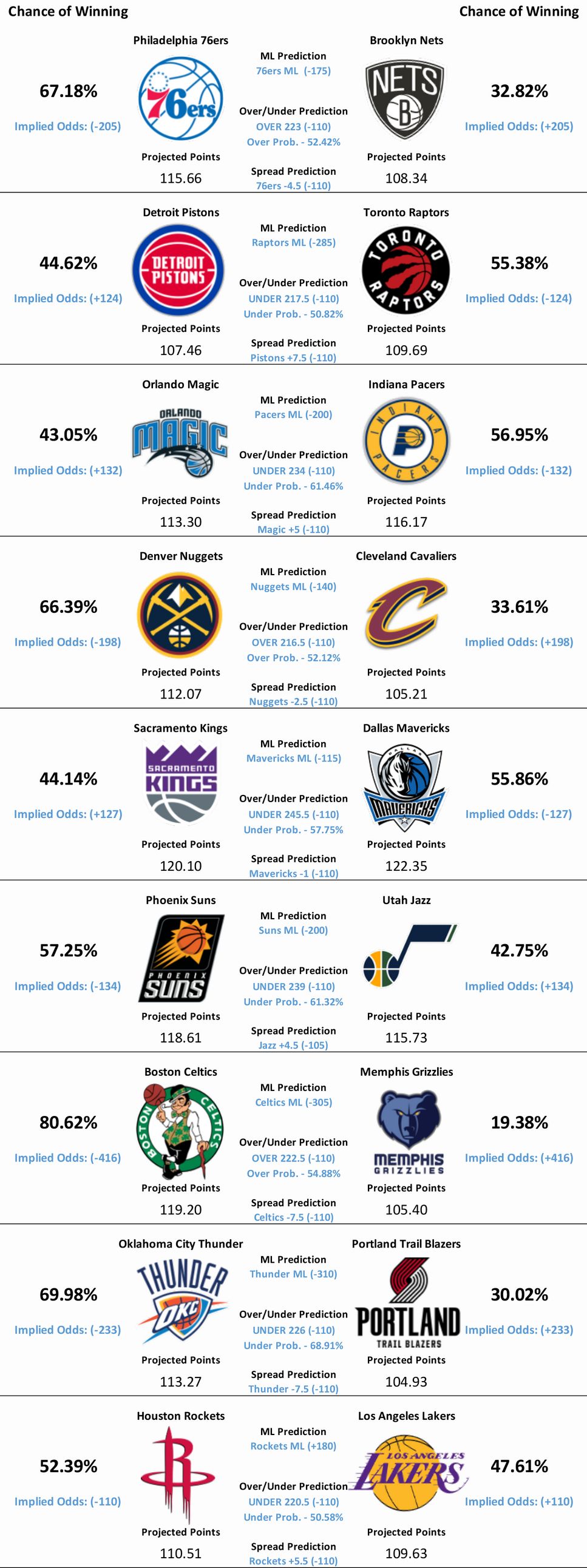 The NBA has blessed us with a nine-game slate alongside today’s NFL games. Our model’s predictions for all nine matchups can be found below.