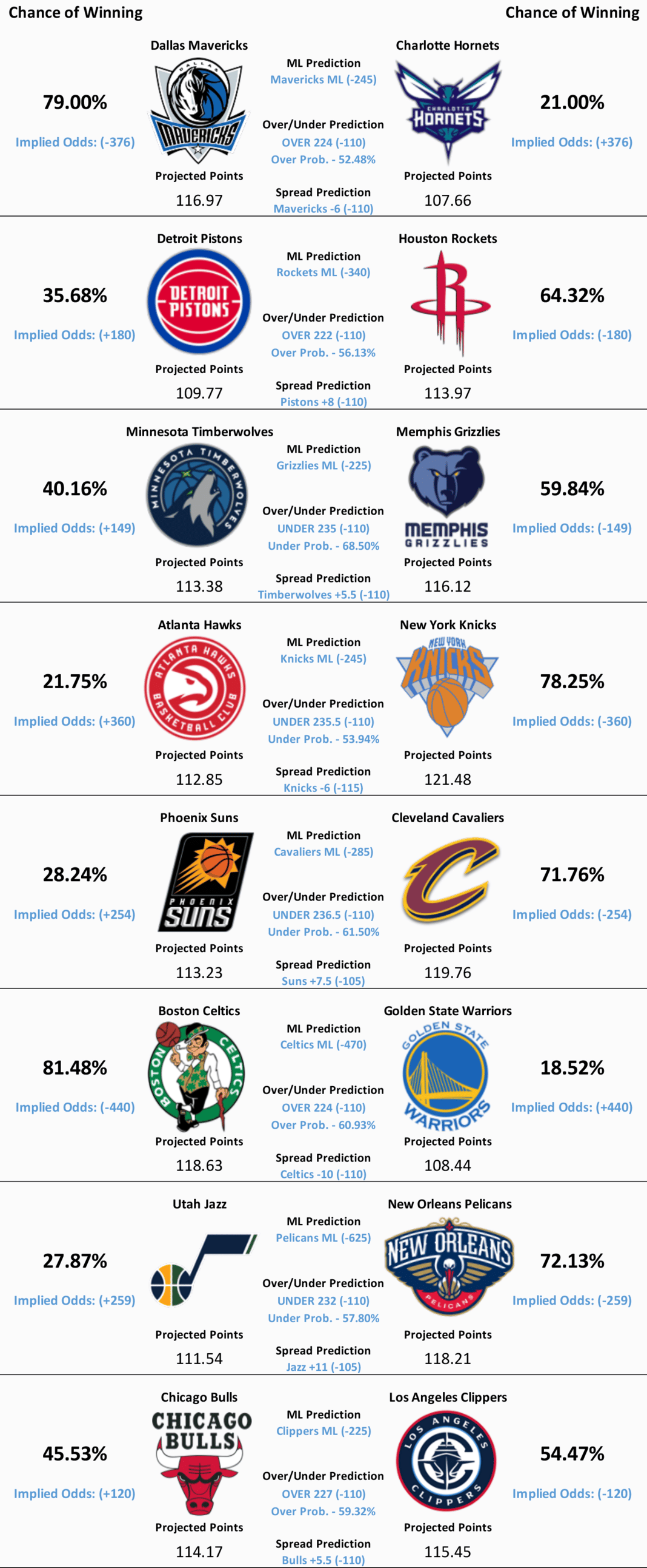 Eight NBA games are scheduled to take place today. Our model’s predictions for all eight matchups can be found below.