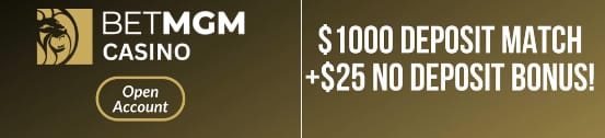 BetMGM Casino- Receive a deposit match up to $1,000 plus an additional $25 on the house!