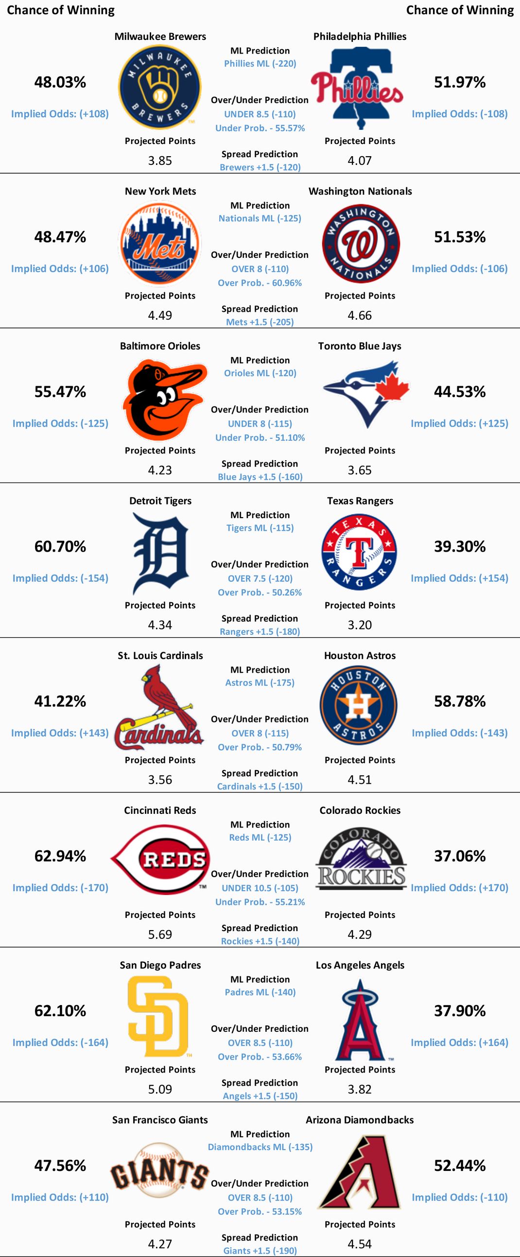 Eight MLB games are scheduled to take place today. Our model’s predictions for all eight matchups can be found below.