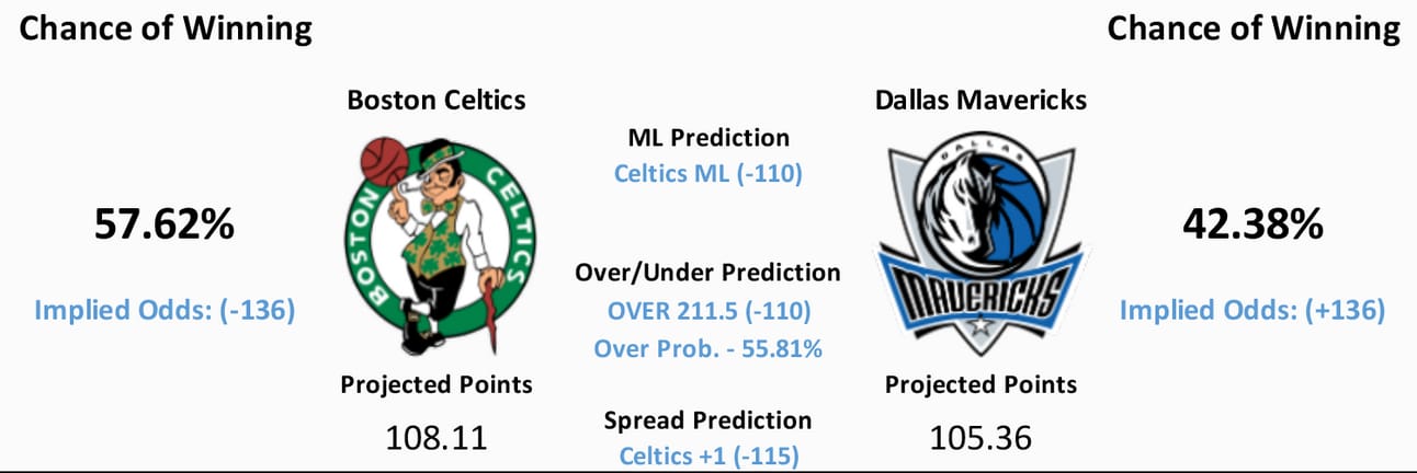 Model Predicts- Celtics ML, OVER 211.5, Celtics +1
