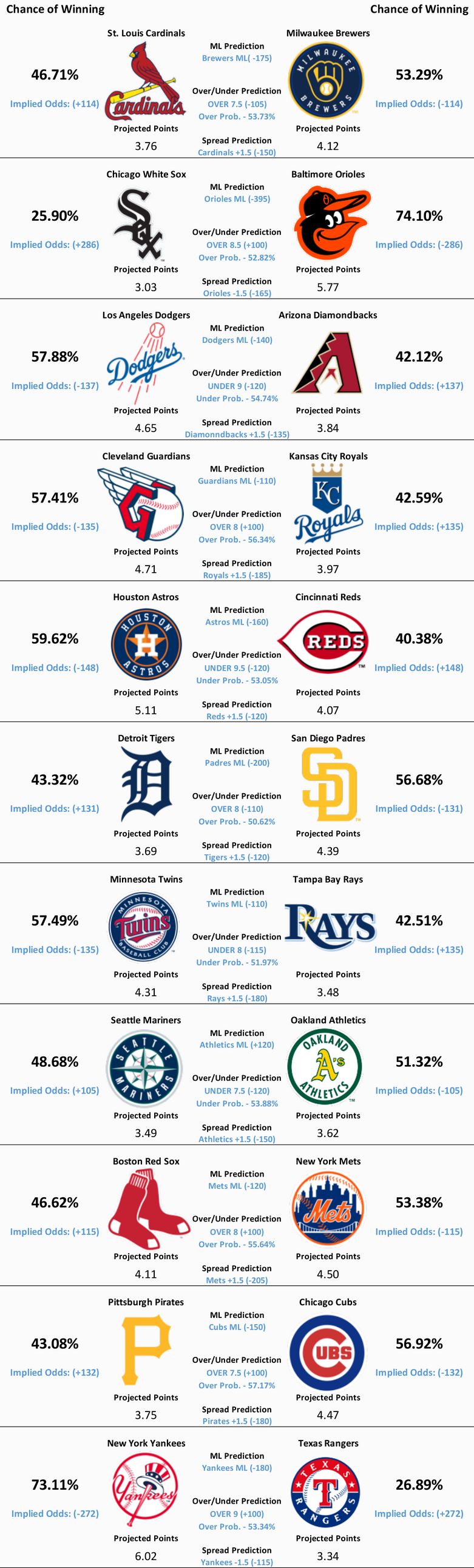 11 MLB games are scheduled to take place today. Our model’s predictions for all 11 of those matchups can be found below.