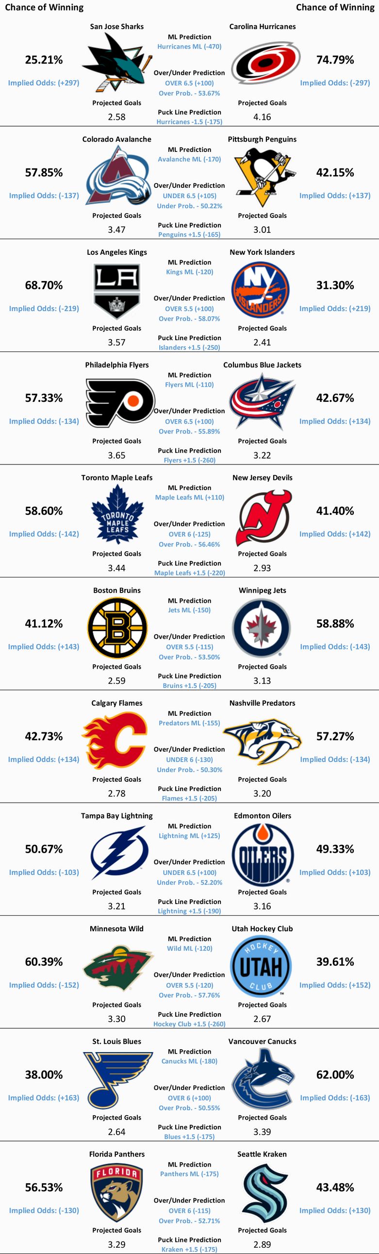 11 NHL games are scheduled to take place today. Our model’s predictions for all 11 matchups can be found below.