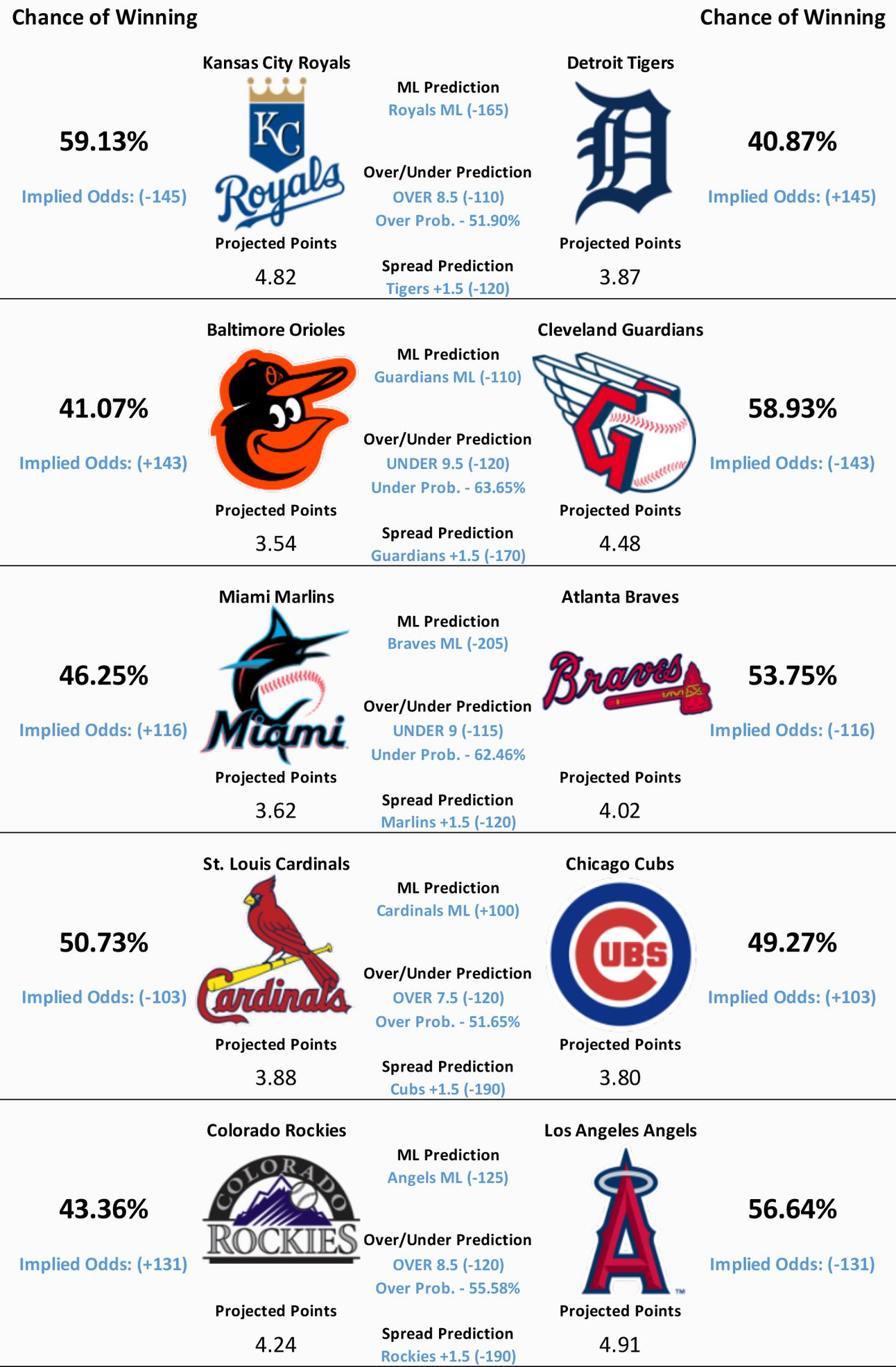 Model Predicts- Royals ML, OVER 8.5, Tigers +1.5