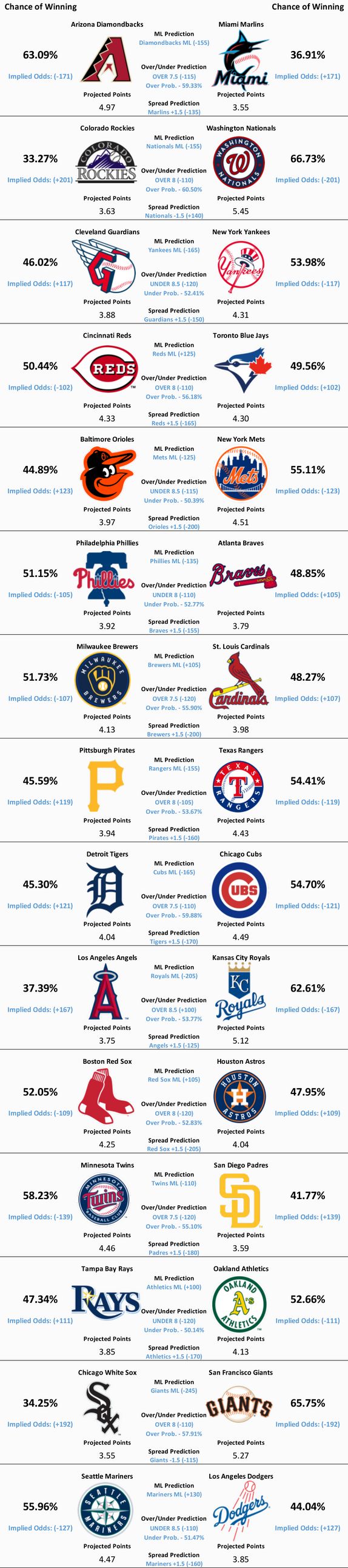 15 MLB games are scheduled to take place today. Our model’s predictions for all 15 matchups can be found below.